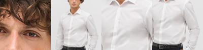 Fitted style.Stiffened collar.Self colour buttons.Back yoke.Two button adjustable cuffs with button on cuff gauntlet.Straight hem.Tear out label.